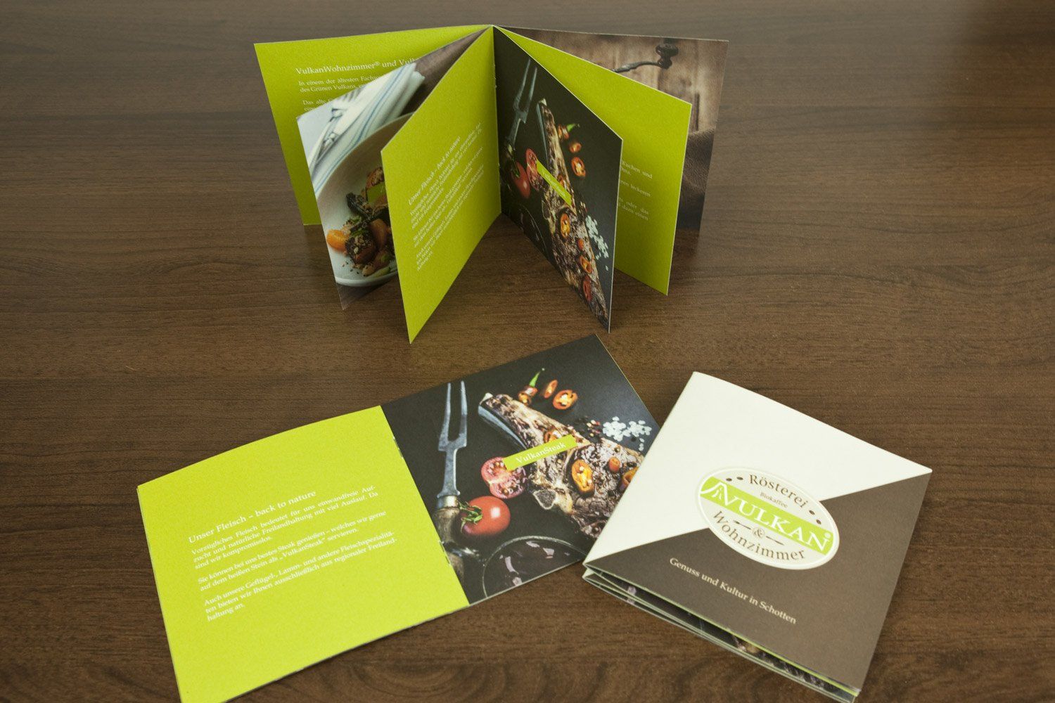 Das VulkanWohnzimmer in Schotten setzt auf hochwertige Produkte und Biofleisch aus der Region. Dies wird auch in den Imagebroschüren wiedergespiegelt. Die 12-seitigen Broschüren und alle anderen Drucksachen wurden auf Natur- bzw. Recyclingpapier gedruckt.